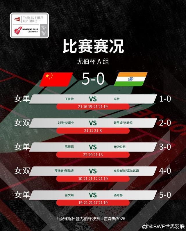直播吧4月28日讯 2026年汤尤杯小组赛,中国5-0横扫印度小组头名晋级淘汰赛。